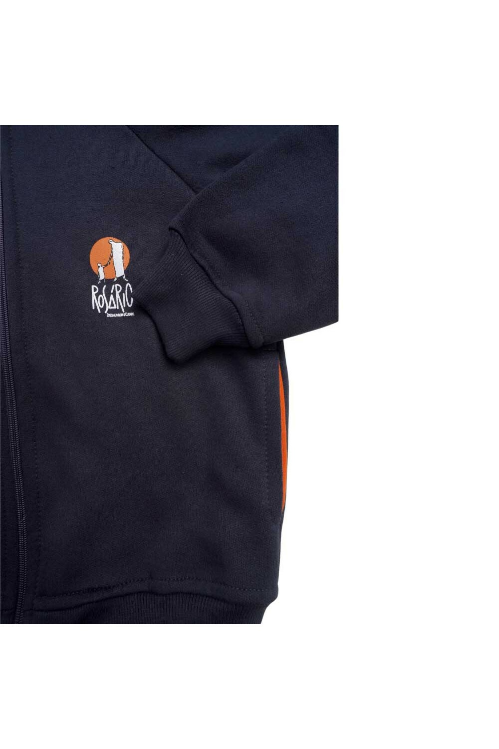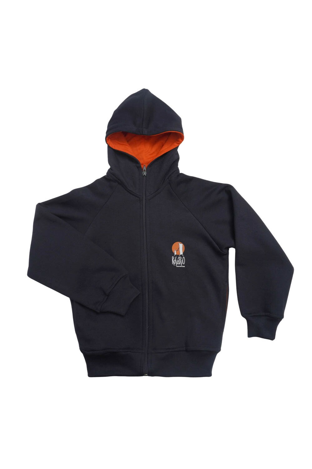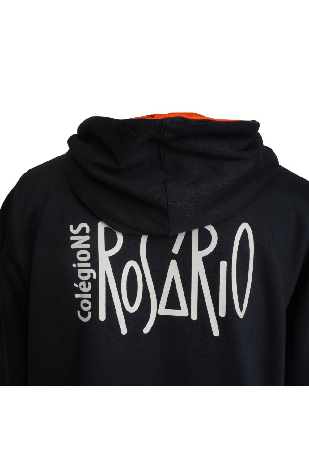 Modelo com zíper frontal, capuz, gola alta e estampa em silk do Colégio Rosário.